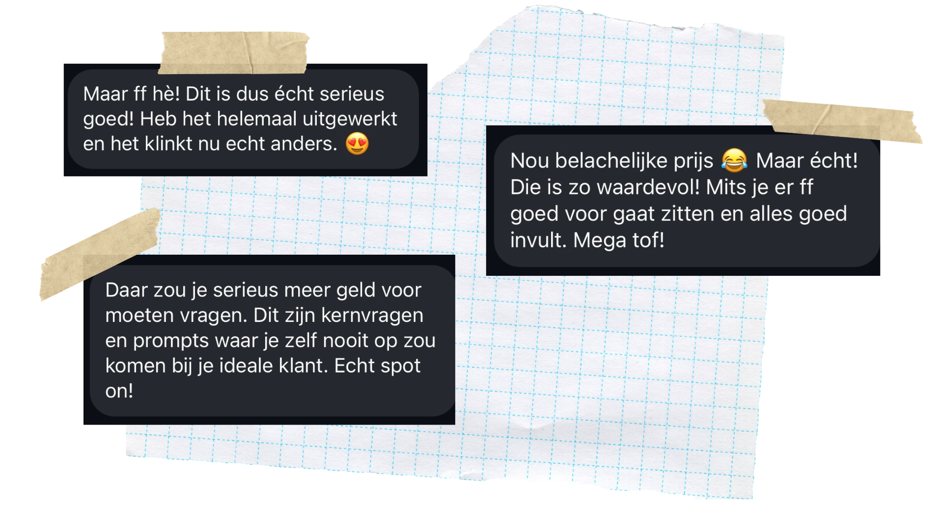 Ik doe non-stop klantonderzoek. Niet alleen voordat ik een product maak. Ook tijdens en achteraf. Ik leer je bepalen waar jouw doelgroep ‘ja’ tegen wíl zeggen. Maar ook hoe je dit op de juiste manier articuleert. Zodat een klant het kan "pakken". Je hoeft dus niet de Fancy Nancy uit te hangen en poëtische proza's te posten op je socials. Je gaat ook nadenken over zijn/haar behoeftes en hoe jij die (op jouw manier uiteraard) het beste kan vervullen.